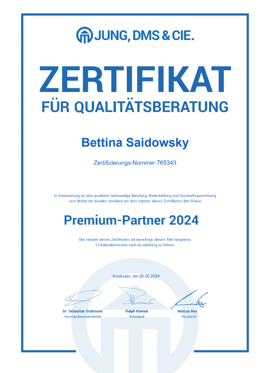 Wir sind erneut „Premium Partner“ im Jahr 2024 der Jung, DMS & Cie. AG. Unsere Kunden können sich darauf verlassen, dass wir stets nach bestem Wissen und Gewissen handeln, um unabhängige Beratung zu bieten, die auf ihre individuelle Situation abgestimmt ist, und passende, anlegergerechte Produkte zu finden.